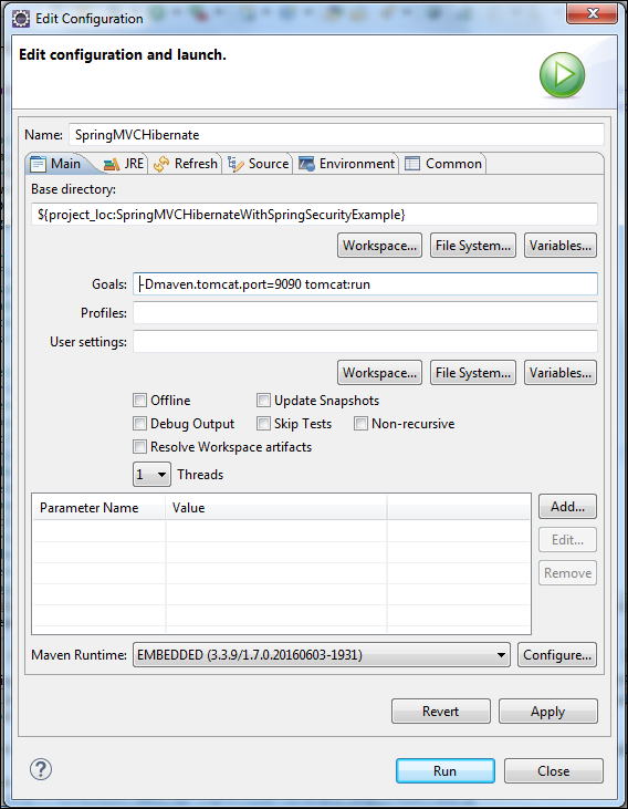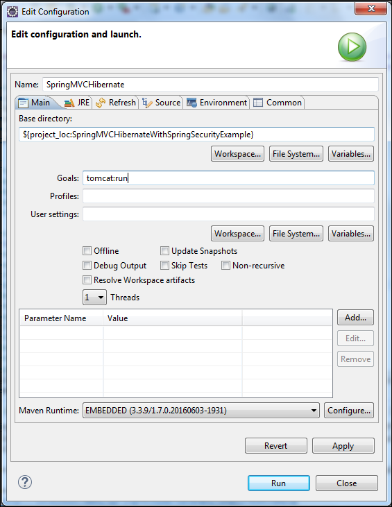 If you have not created a “Run Configuration” yet, It will opne a new configuration with some auto fillled values.